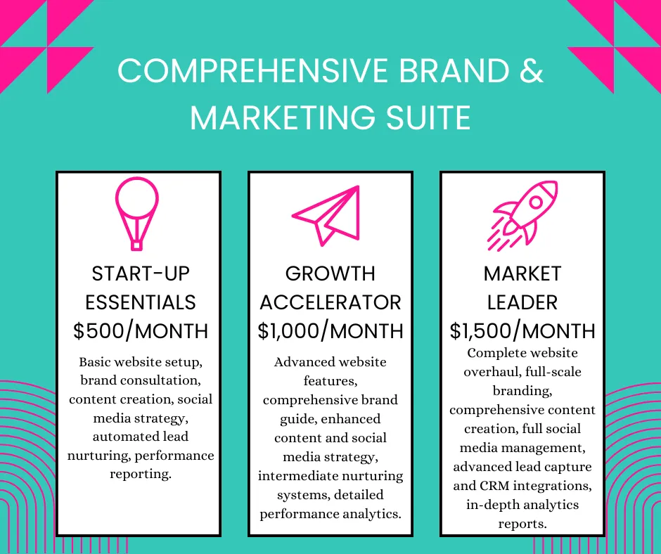 We offer a range of services including brand strategy workshops, website audit and optimization, social media starter kits, and content creation. We also provide subscription-based plans for ongoing branding and marketing support.
